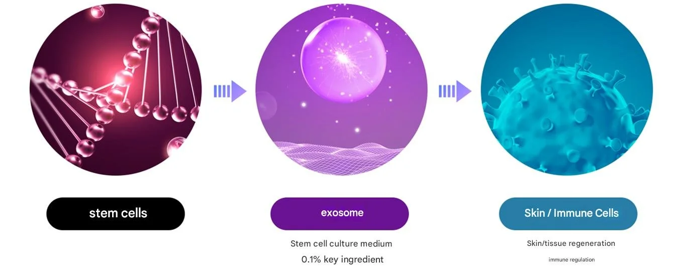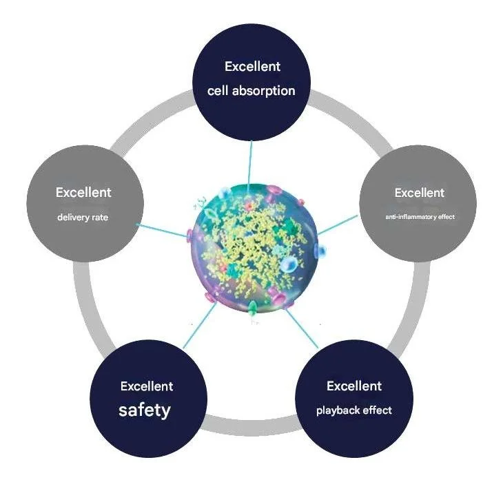 Exosomes not only facilitate the circulation of RNA and essential proteins between cells(such as fibroblasts, keratinocytes, and immune cells), but also carry numerous growth factors, cytokines and genetic material. This helps promote skin tissue repair and skin cell renewal.